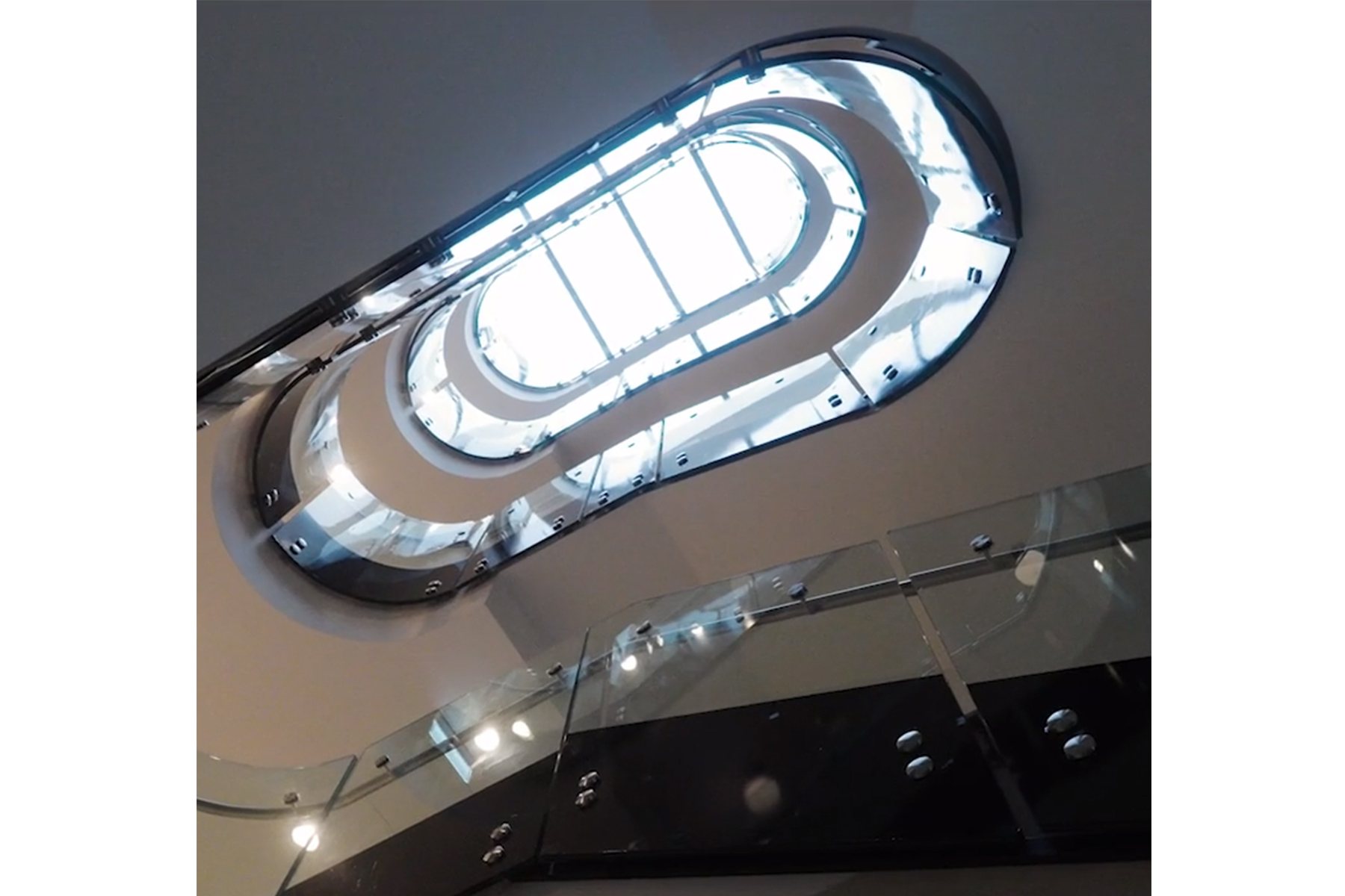 At roof level, we designed and manufactured two Bespoke Curved Multi-Section Rooflights, one of which perfectly parallels the graceful shape of the spiral staircase below. During the day, this notably large rooflight illuminates the staircase all the way to the building’s ground floor.