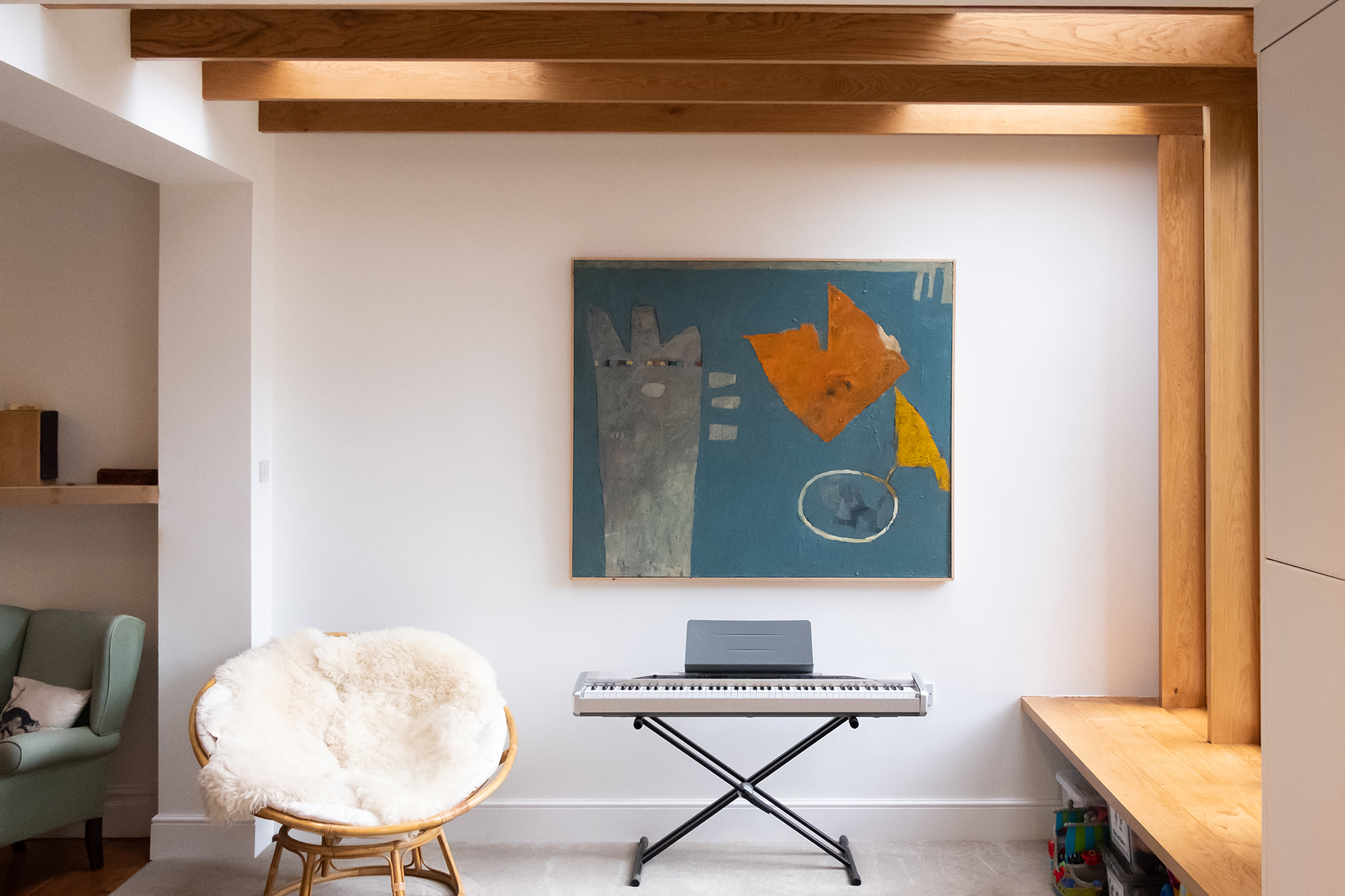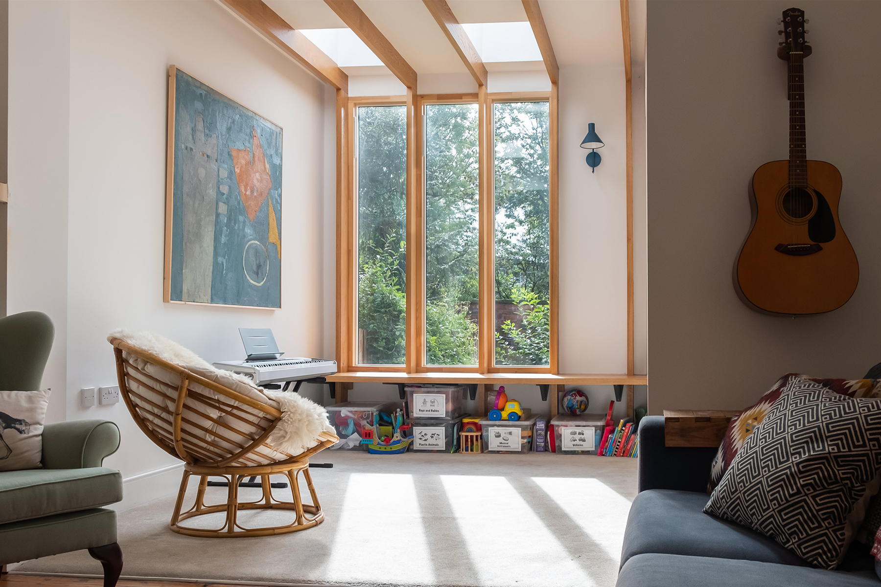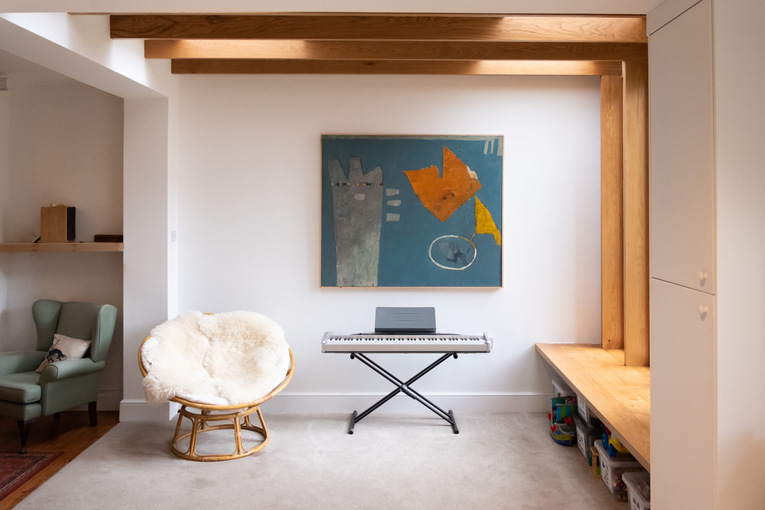 Decorated with unique artwork, musical instruments, children’s toys and mixed styles of furniture, the room caters to the whole family. This is a space designed to create cherished memories, and we are proud to have been involved in such a charming residential project.
