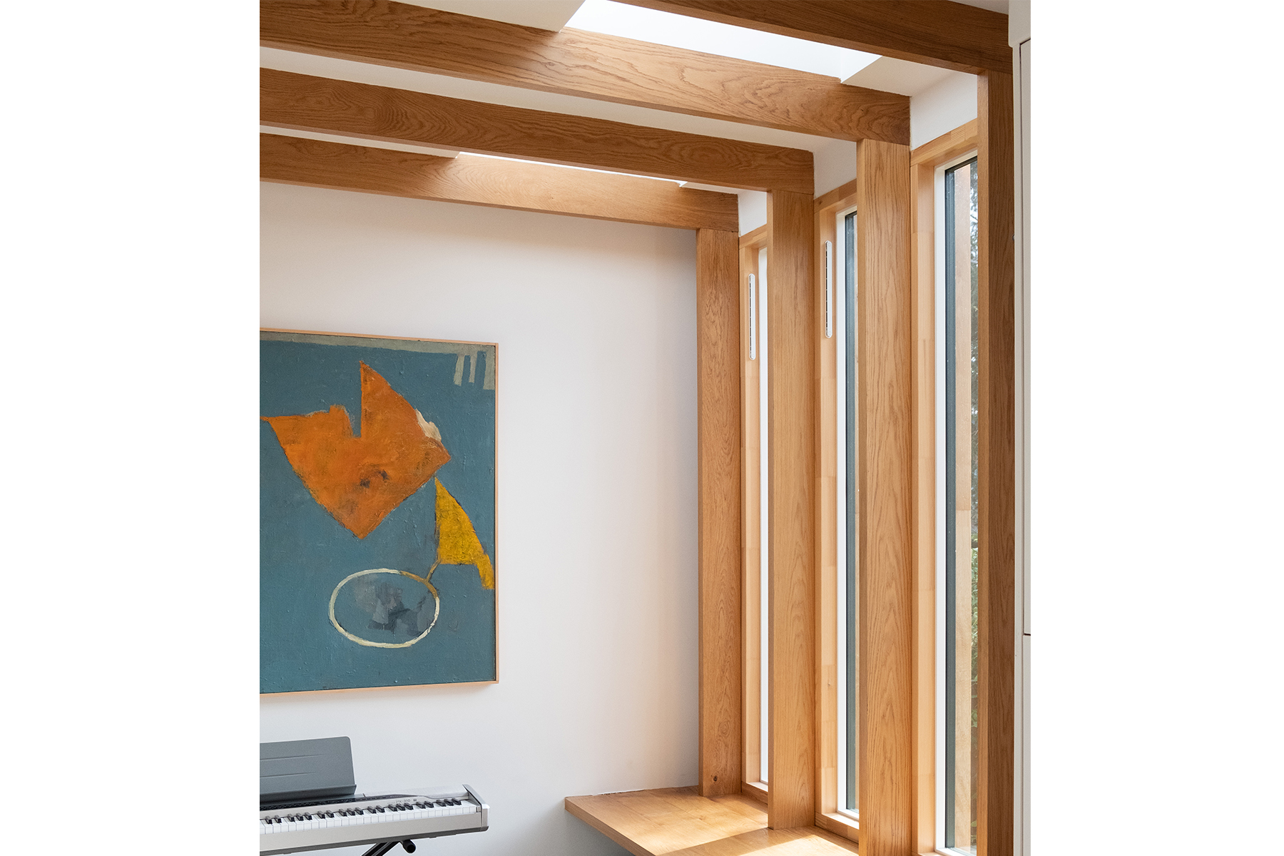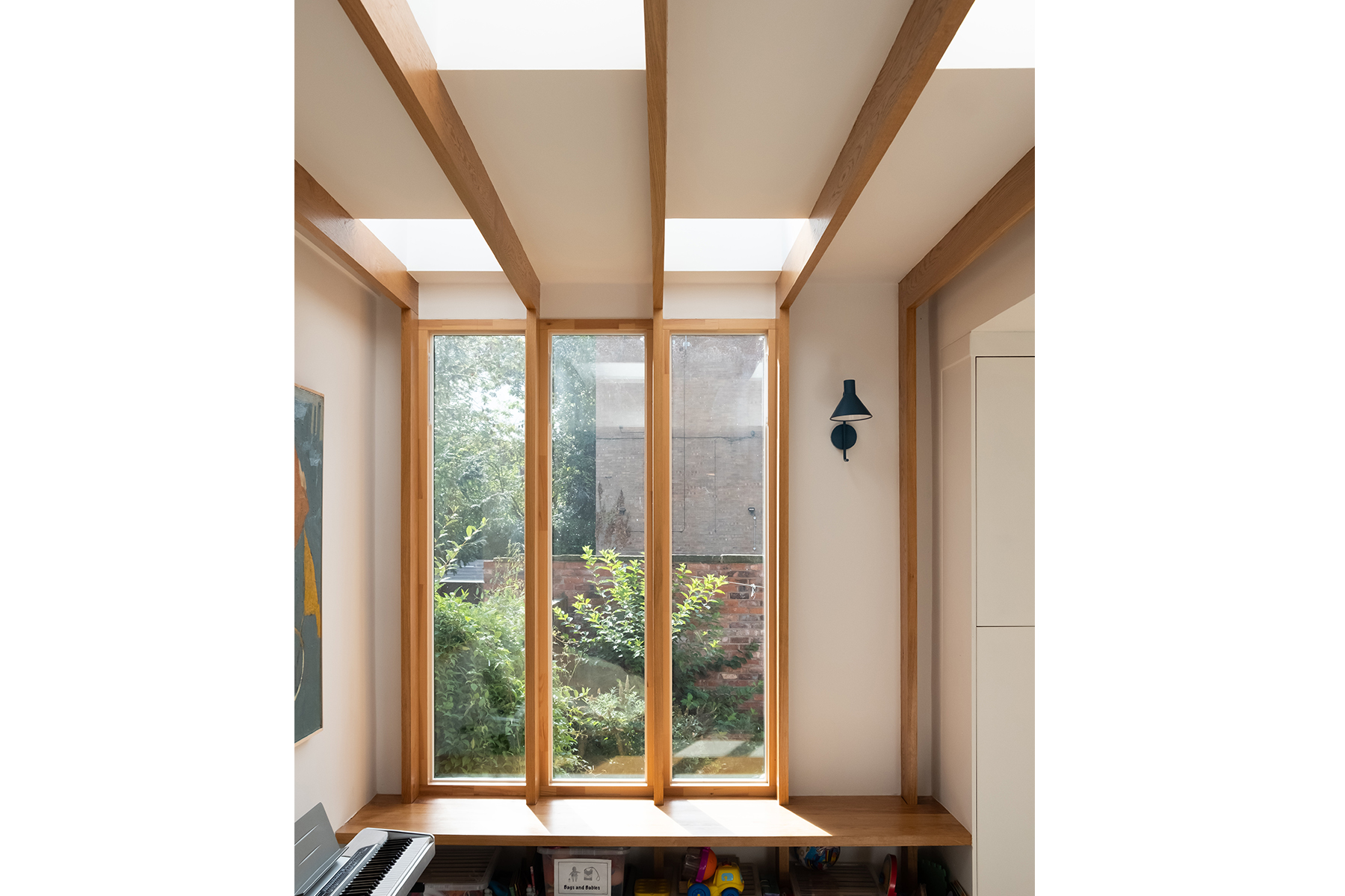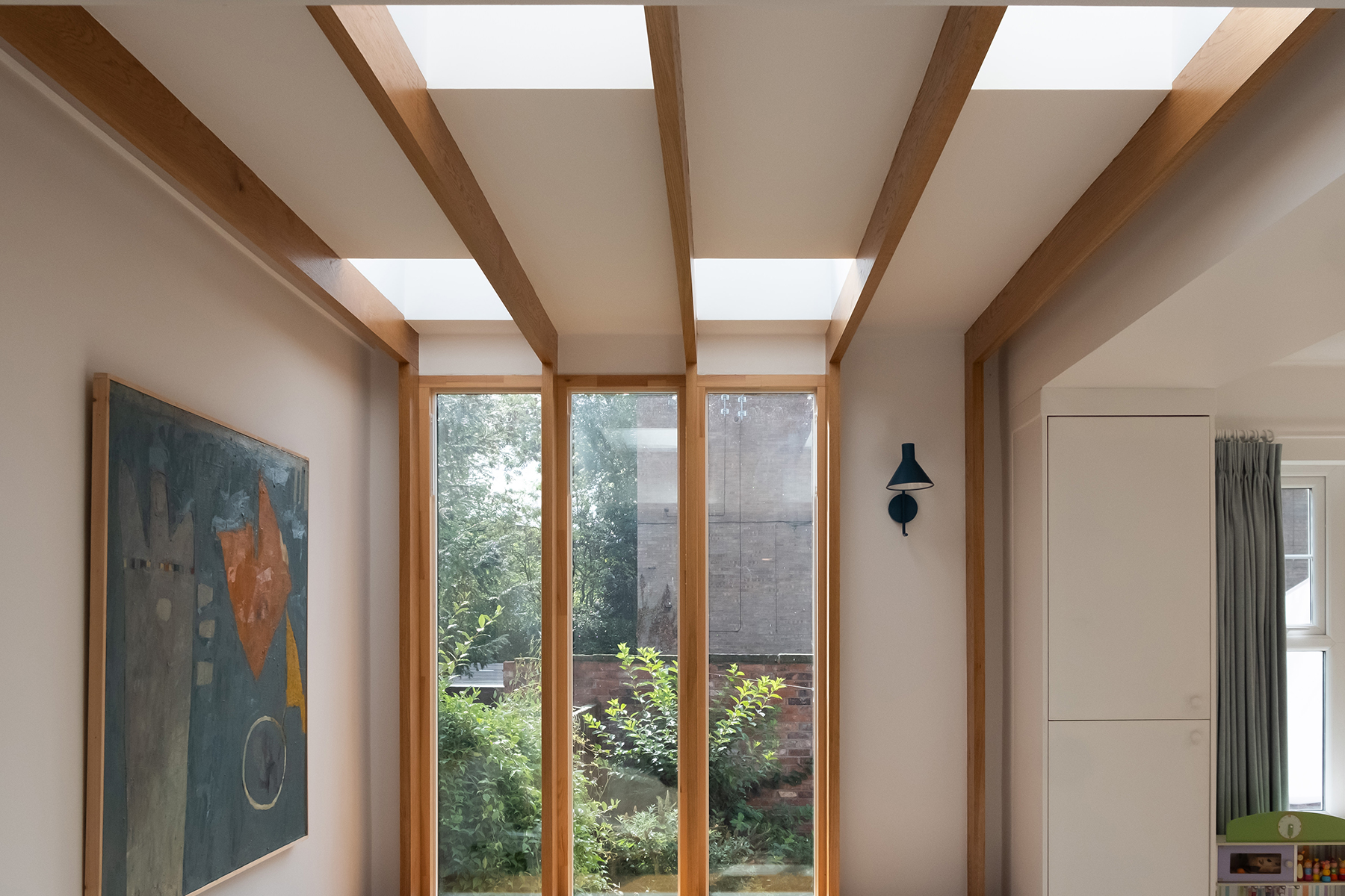 Using a white wall to accentuate the wood detailing, Claire creates an innovative, homely atmosphere. Our seamlessly integrated rooflights, arranged in a playful pattern, contribute to this by introducing natural warmth and daylight to the extension. A signature feature of our Fixed Flat Glass Rooflights is their simple rectangular shape, which nicely compliments Claire’s choice of tall, slim windows.
