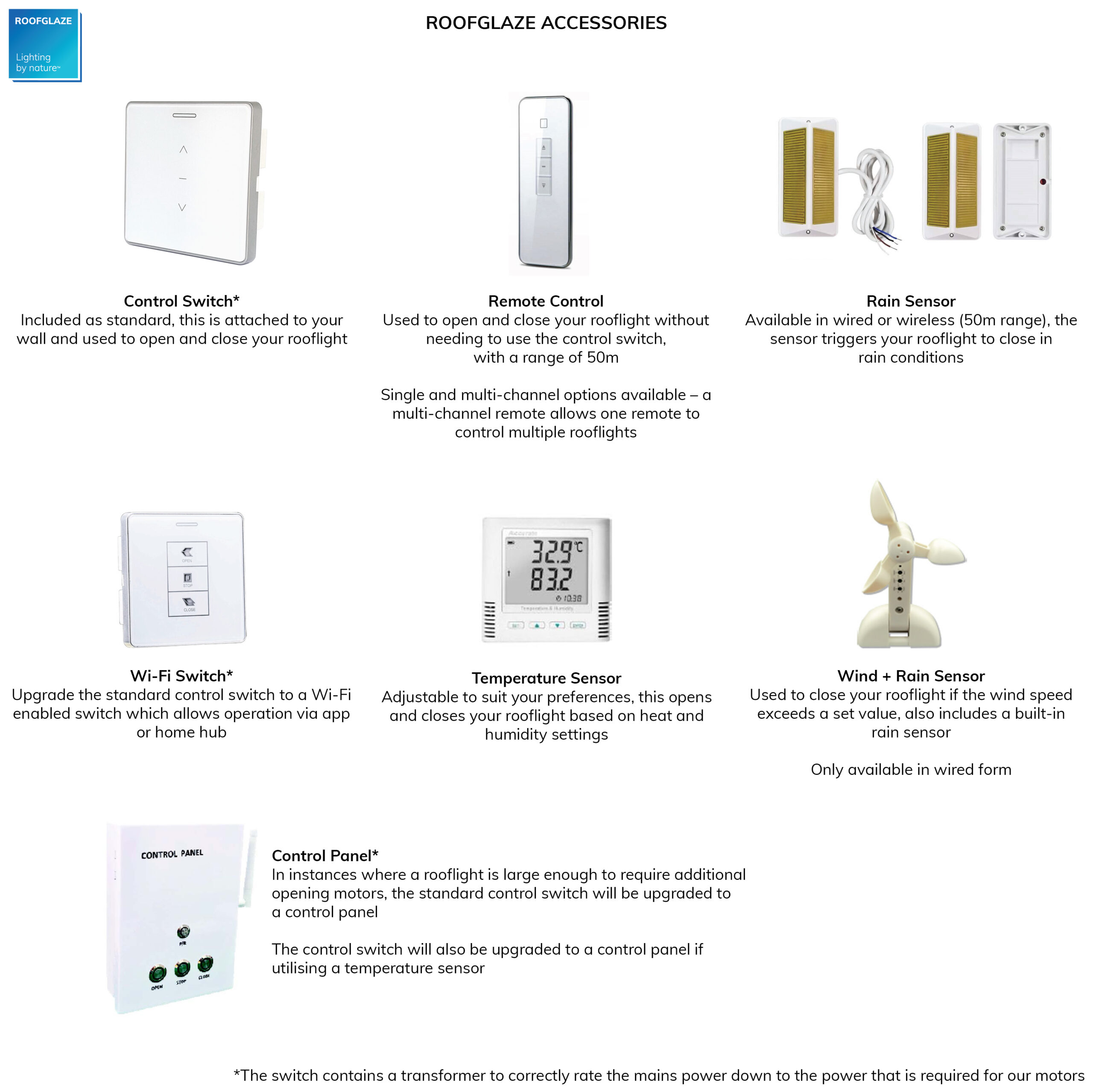 Our Skyway Electric Sliding Flat Glass Rooflights are supplied with a transformer control switch as standard.
